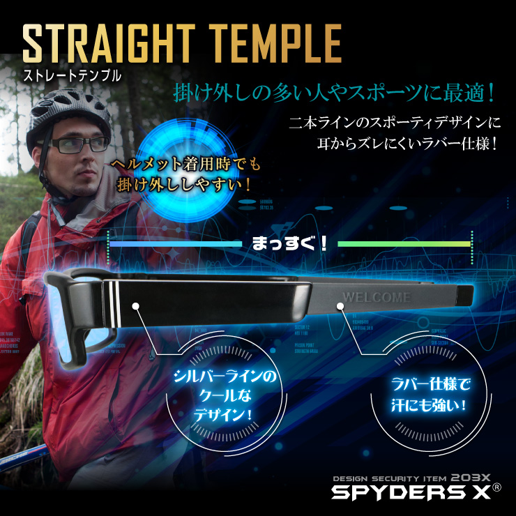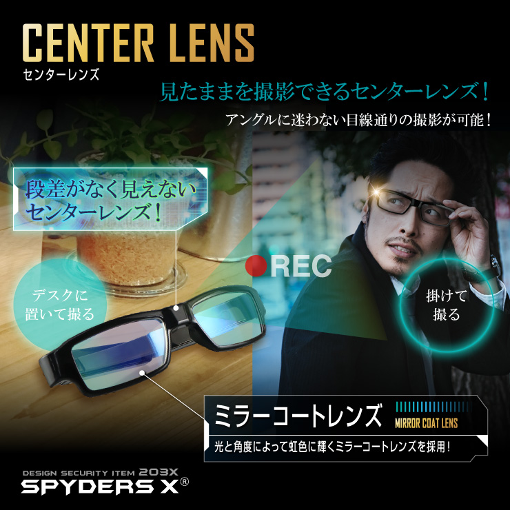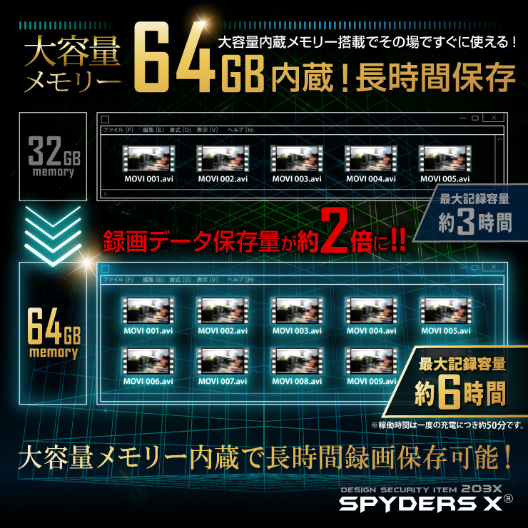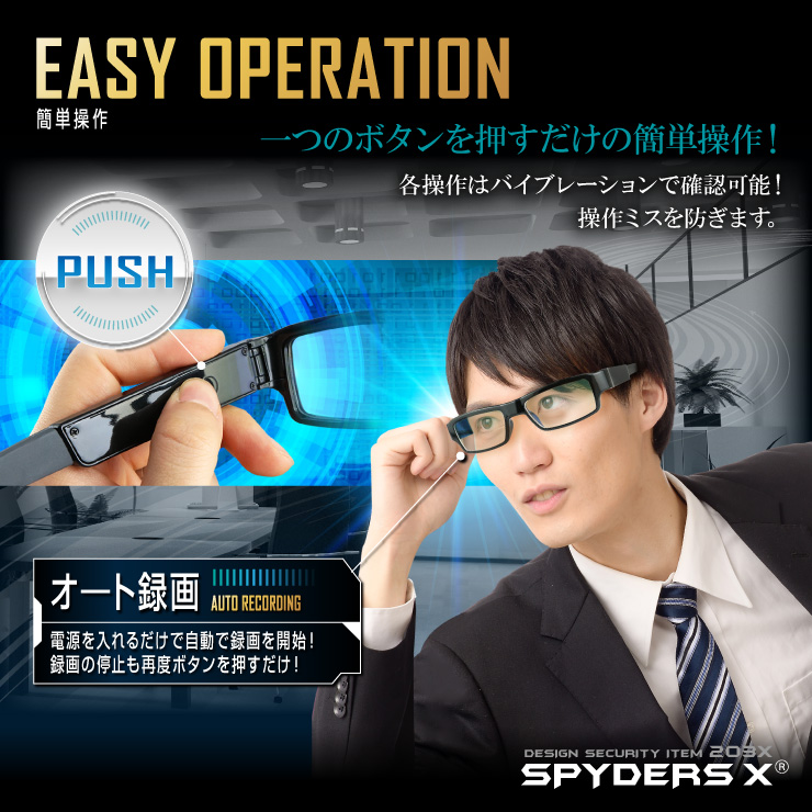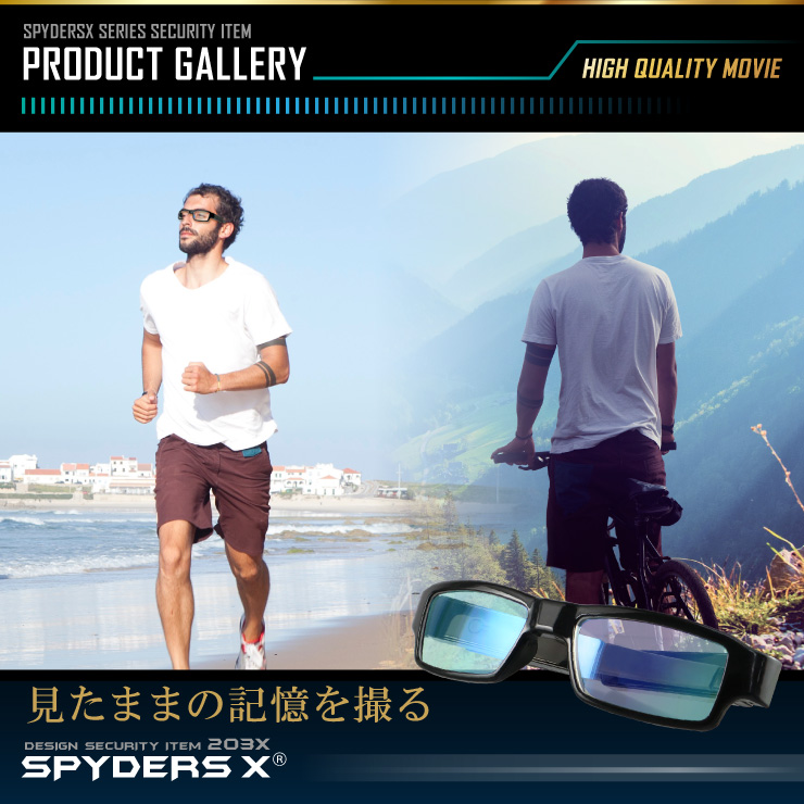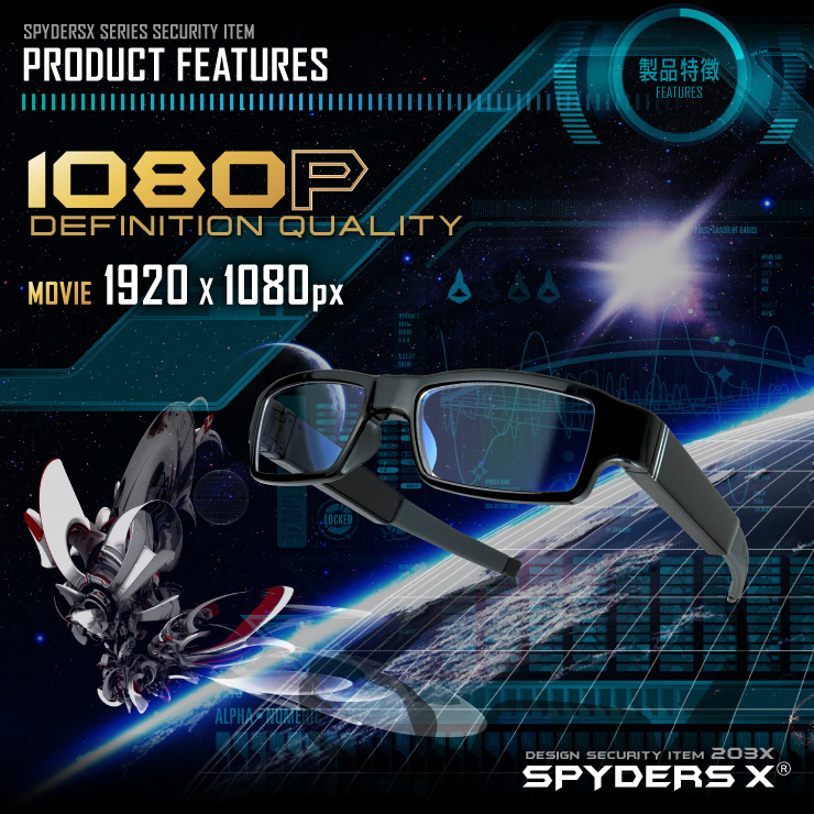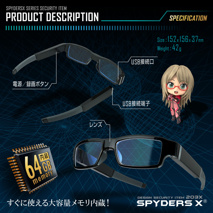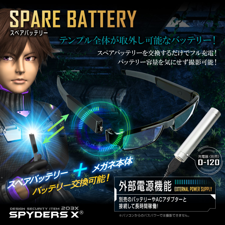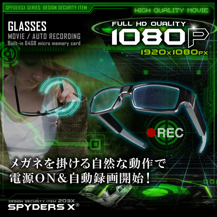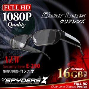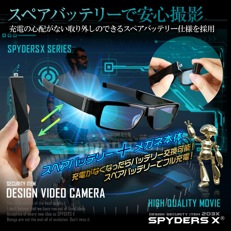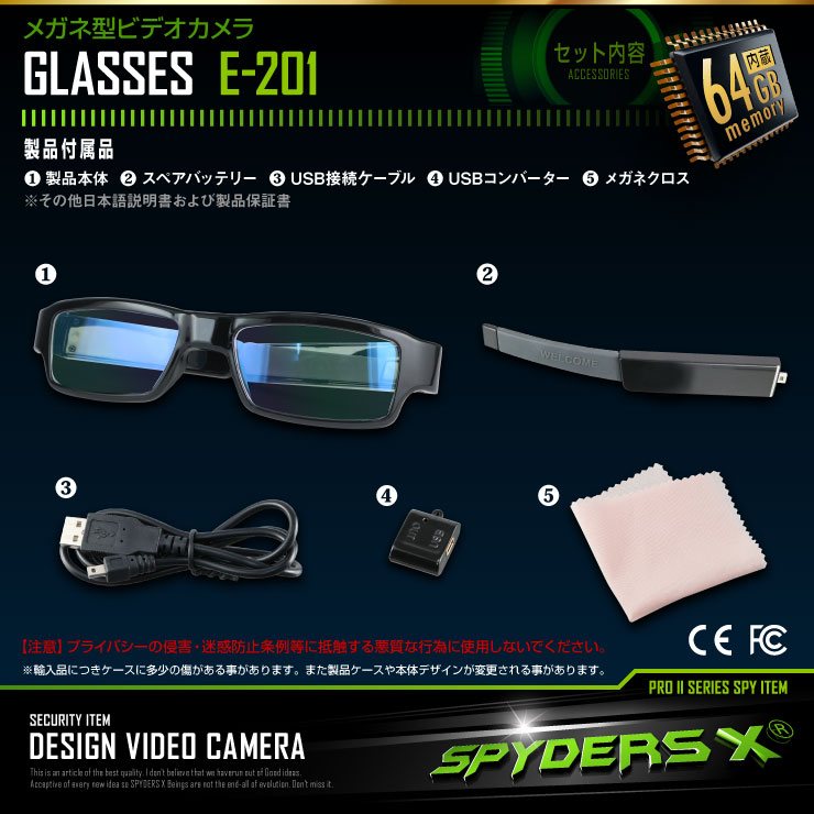 スパイダーズX 小型カメラ メガネ型カメラ 防犯カメラ FHD スペアバッテリー 64GB内蔵 スパイカメラ E-201