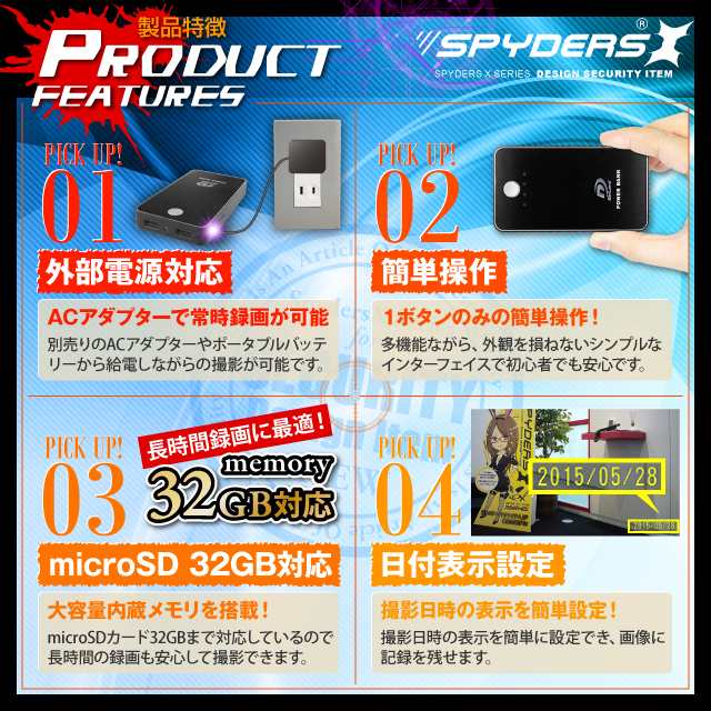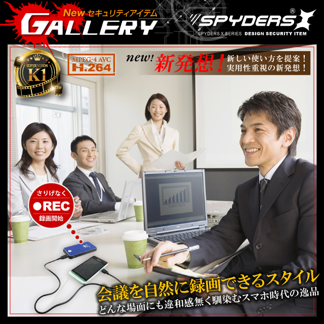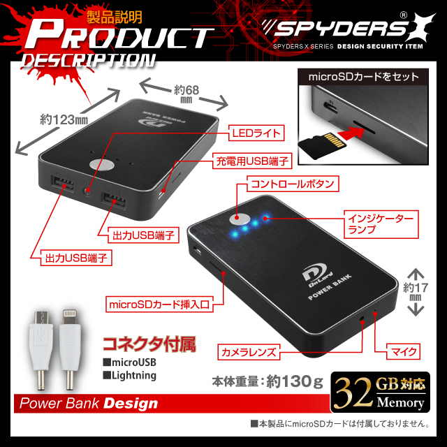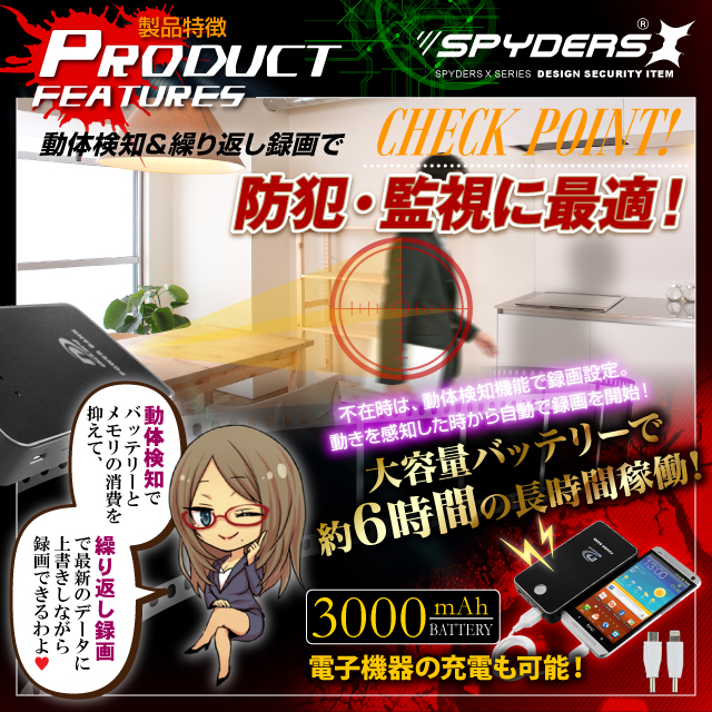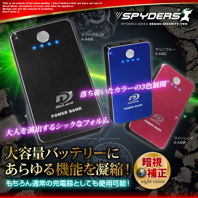 充電器型カメラ モバイルバッテリー 小型カメラ スパイダーズX (A-640B) スパイカメラ ナイトブラック 高画質 暗視補正 長時間録画