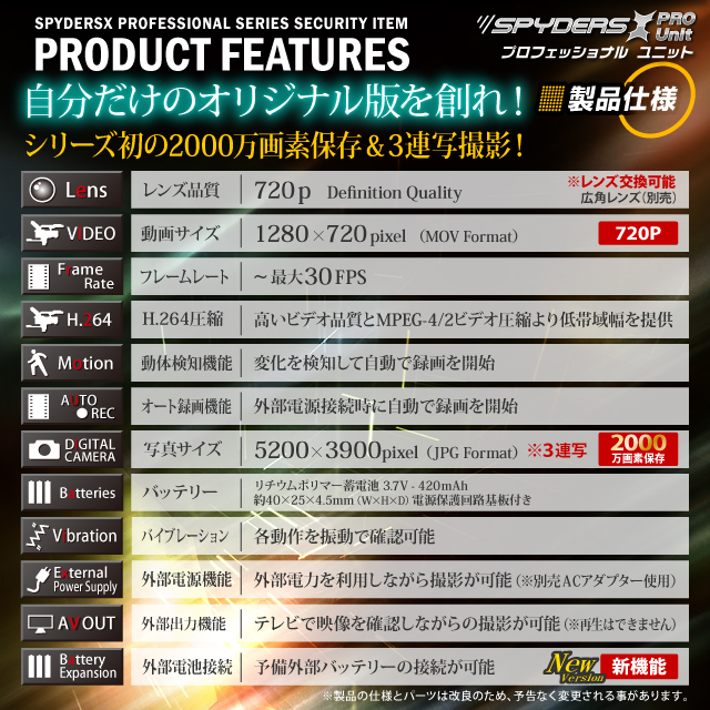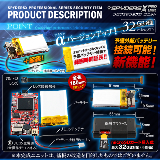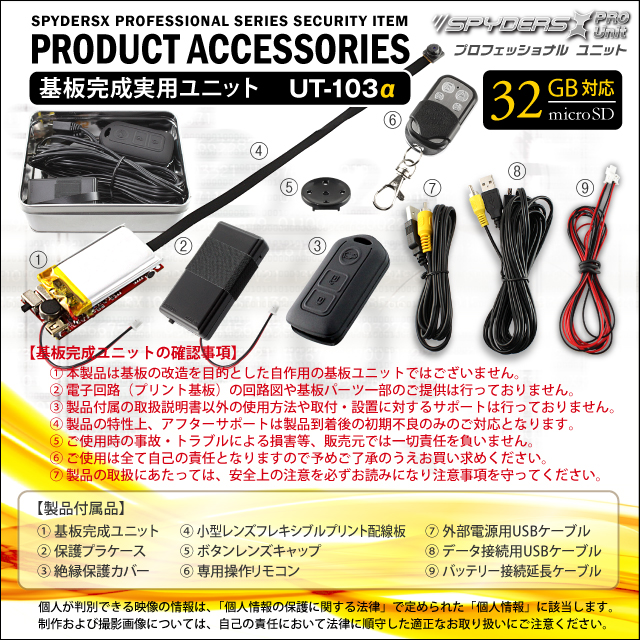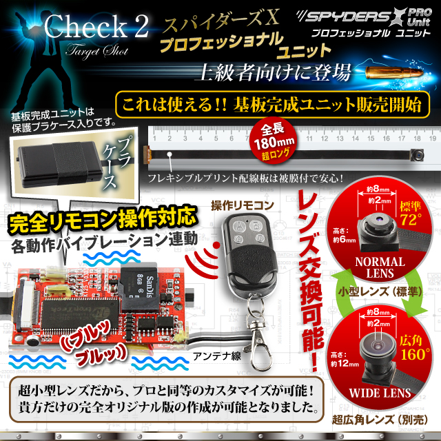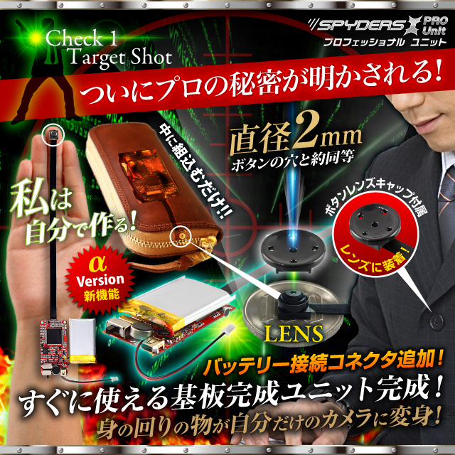 小型カメラ自作キット 基板完成実用ユニット スパイカメラ スパイダーズX PRO (UT-103α) 720P H.264 2000万画素保存 3連写 外部バッテリー接続