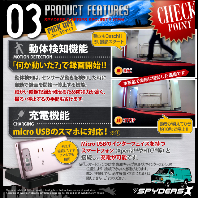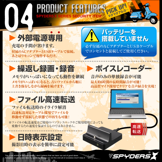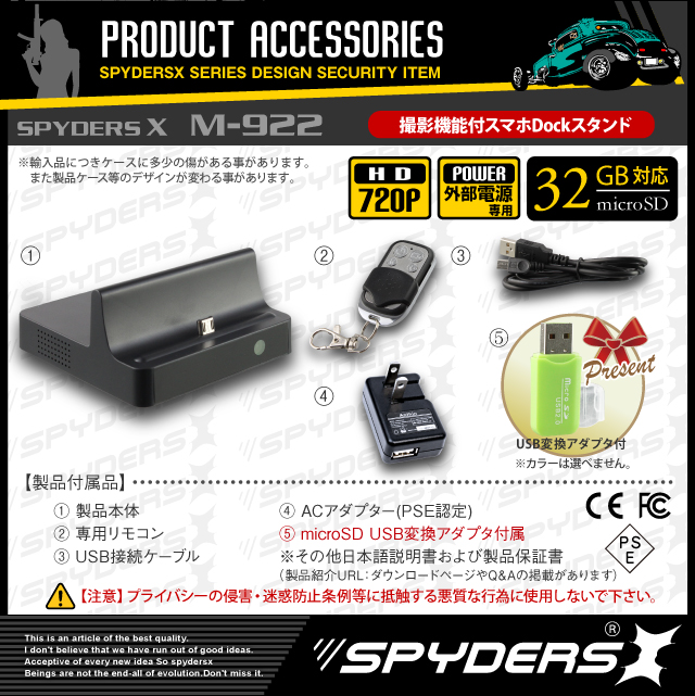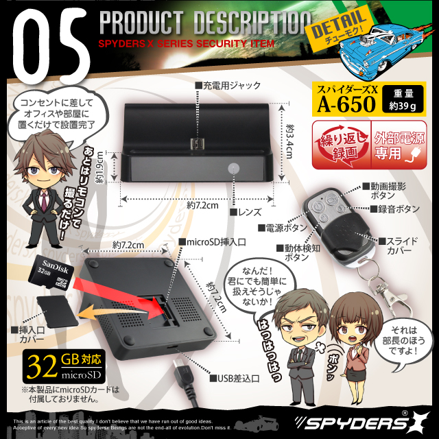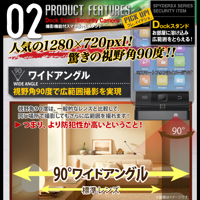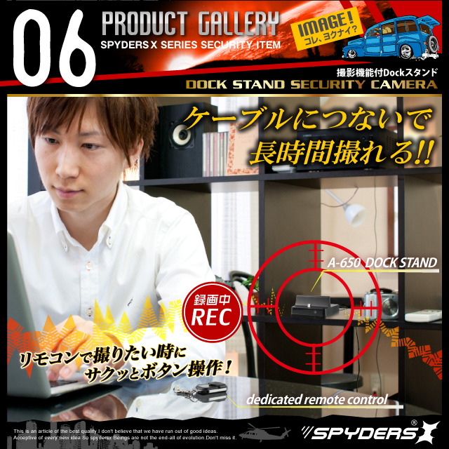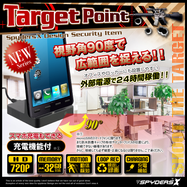 スマホ充電スタンド型 Dockスタンド型 小型カメラ スパイダーズX (A-650)スパイカメラ 広角レンズ 長時間稼働