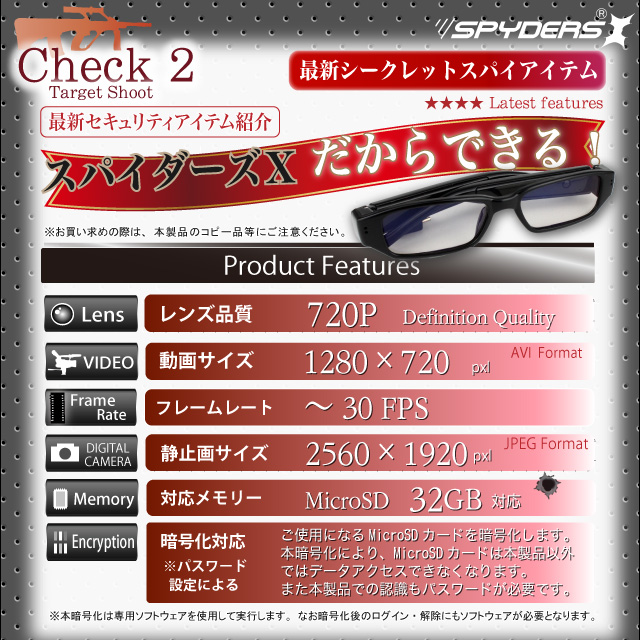 メガネ型カメラ 小型カメラ スパイダーズX (E-215) スパイカメラ メモリ暗号化 MicroSDカード装着式