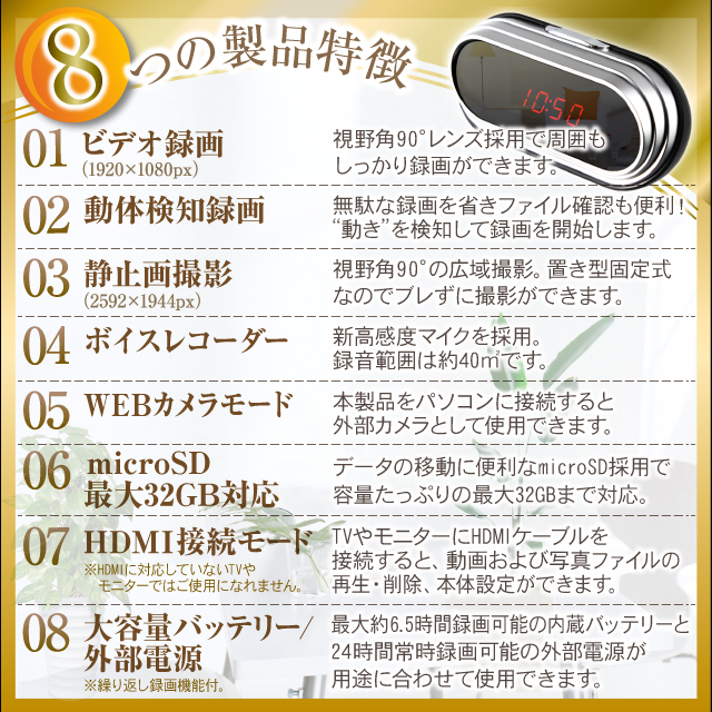 ・本製品はビデオカメラであり、時刻・時計の精度・温度表示・アラーム機能はイミテーションであり精度を保証するものではありません。ご注意ください。