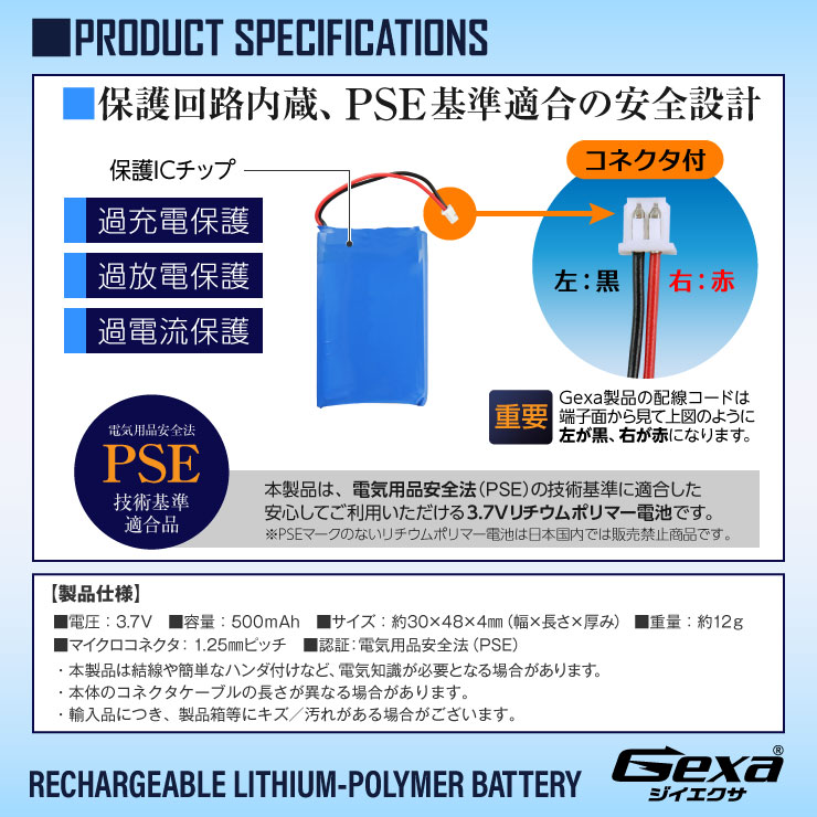 ジイエクサ Gexa リチウムポリマー電池 3.7V 500mAh コネクタ付 ICチップ 保護回路内蔵 PSE認証済 GA-012