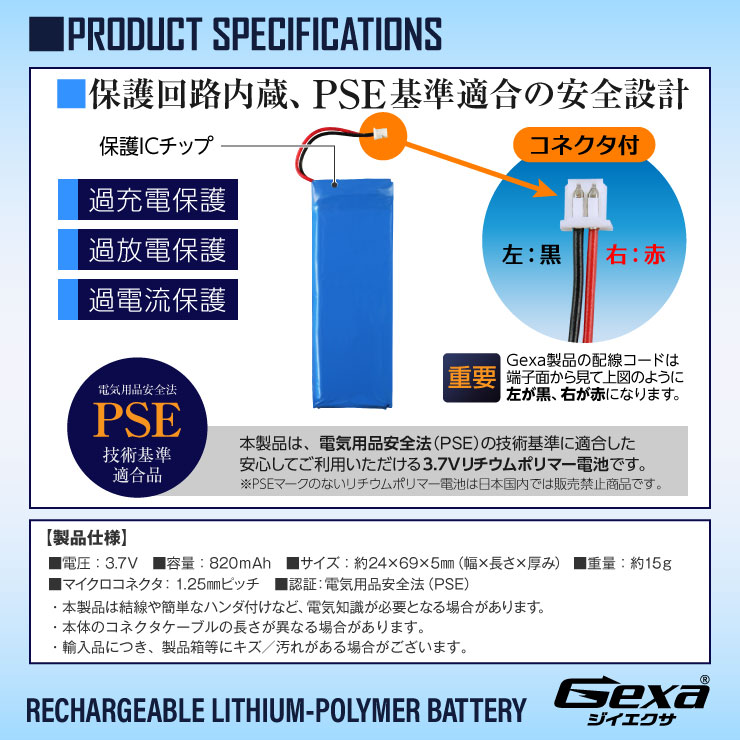 ジイエクサ Gexa リチウムポリマー電池 3.7V 820mAh コネクタ付 ICチップ 保護回路内蔵 PSE認証済 GA-014