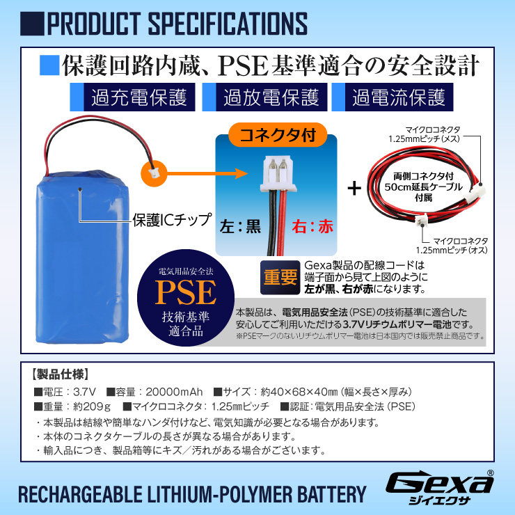 ジイエクサ Gexa リチウムポリマー電池 3.7V 20000mAh コネクタ付 ICチップ 保護回路内蔵 PSE認証済 GA-021