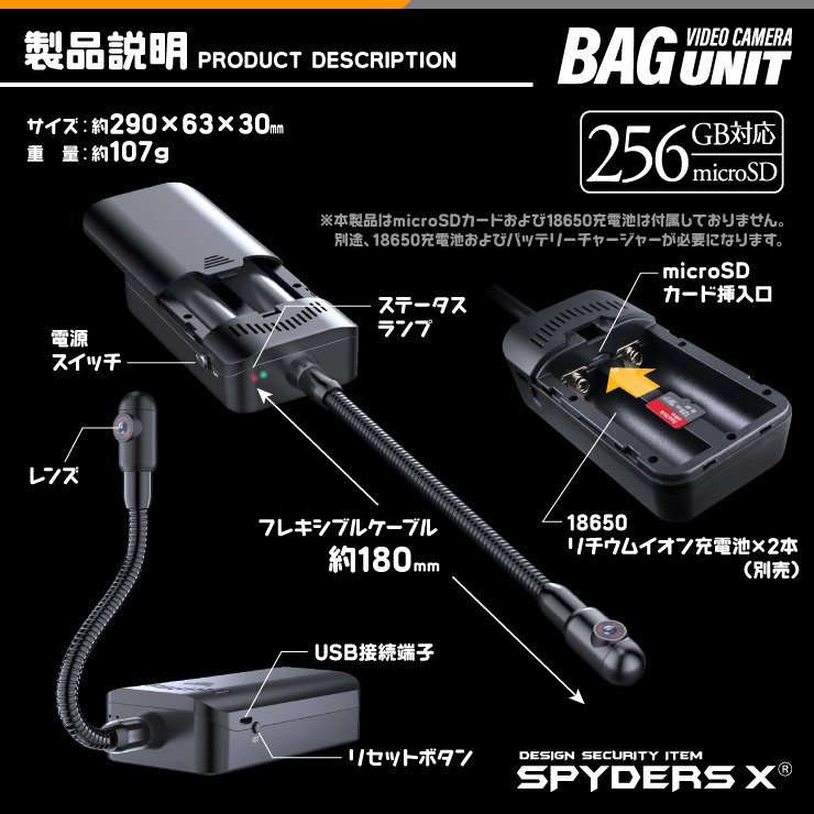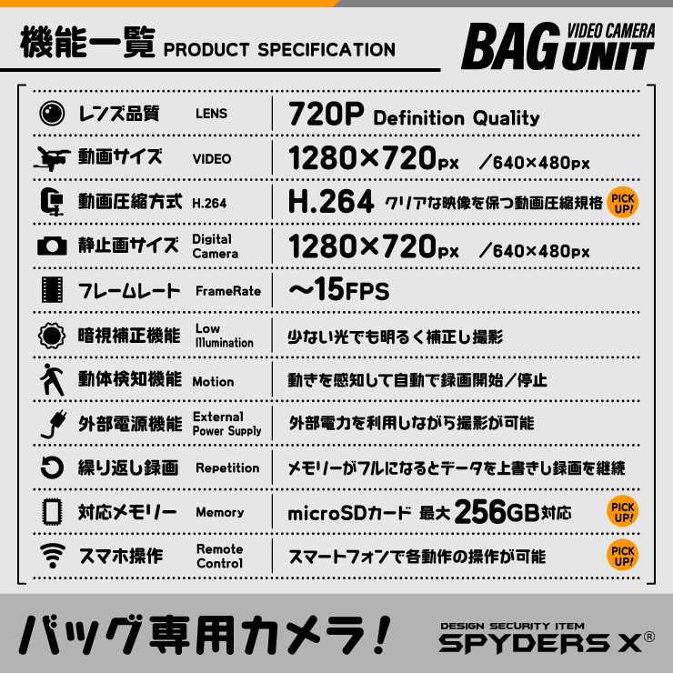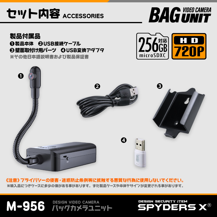 スパイダーズX 小型カメラ バッグカメラユニット バッグ専用 防犯カメラ 720P スマホ操作 256GB対応 スパイカメラ M-956