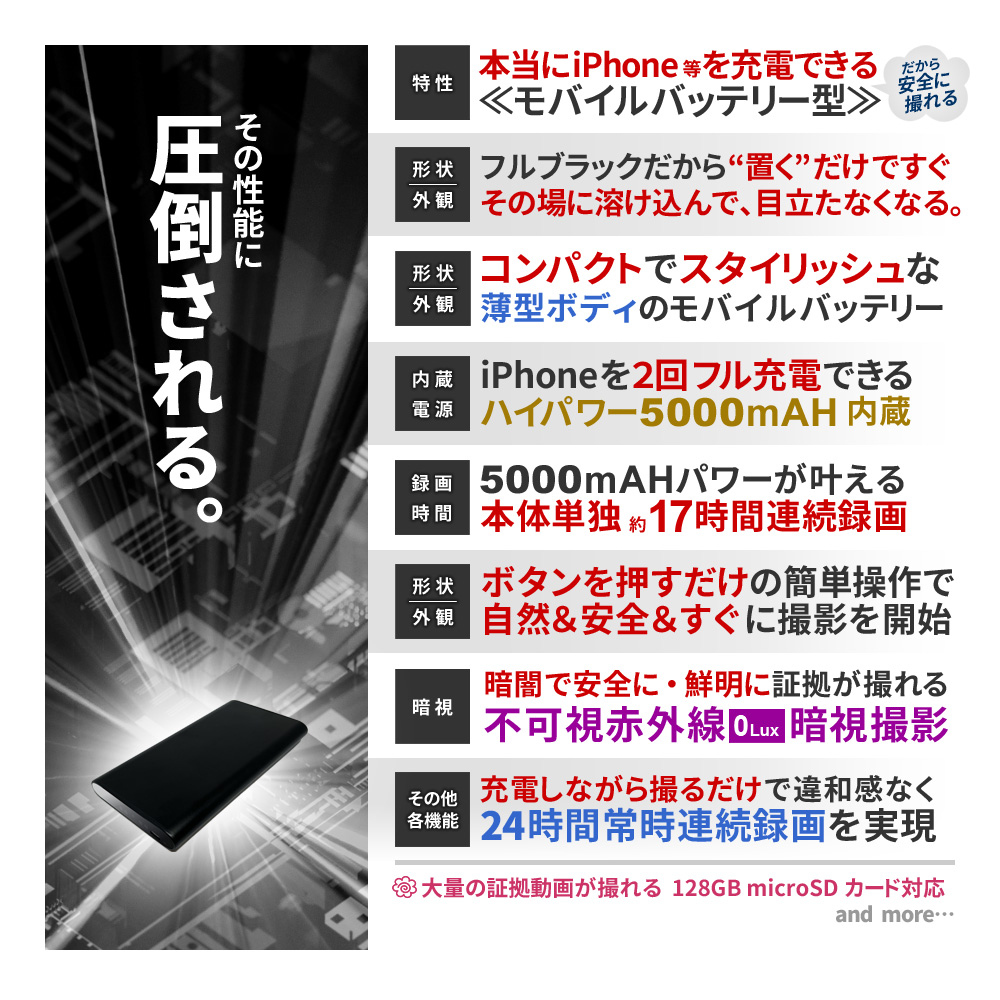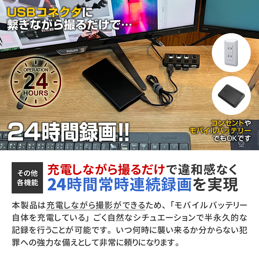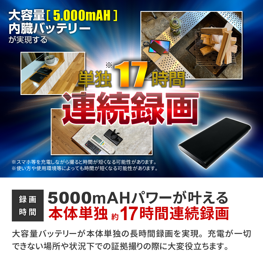 [mc-mc143][モバイルバッテリー型] 5000mAh内蔵 17時間連続録画 暗視撮影で夜でも鮮明に撮れる